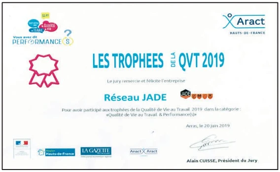 à Arras les Trophées 2019 de la Qualité de Vie au Travail. Cette première édition, organisée pendant la Semaine de la QVT, a distingué  Réseau JADE pour ses projets privilégiant le management participatif.