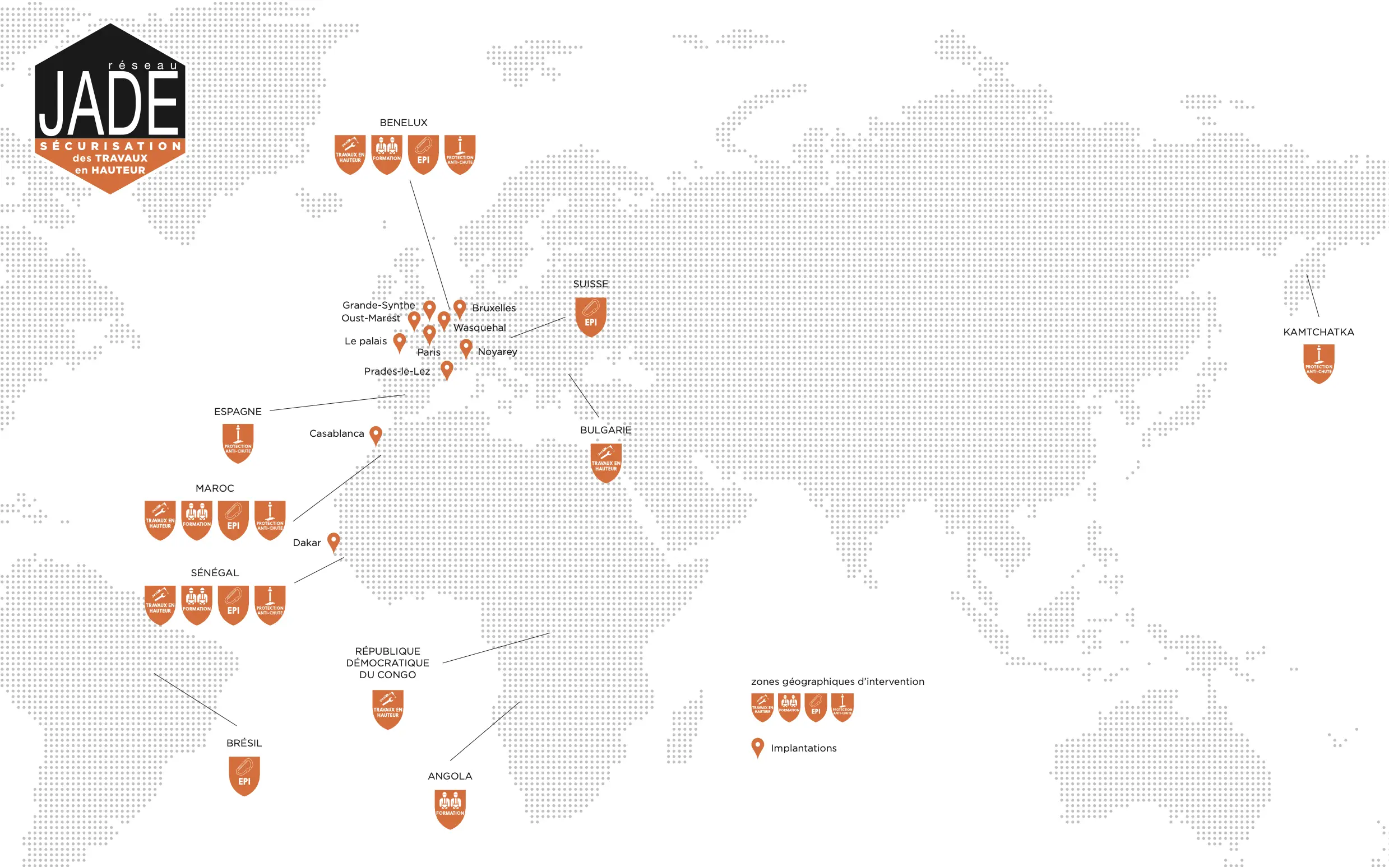 RESEAU-JADE, c’est une équipe de plus de 120 spécialistes de la sécurité pour les travaux d’accès difficile. Elle vous propose ses compétences partout en France, en Europe et en Afrique, pour l’ensemble de notre offre dédiée aux travaux, à la formation, à la mise en place de solutions antichute et à la distribution d’équipements de protection individuelle et collective (EPI et EPC).